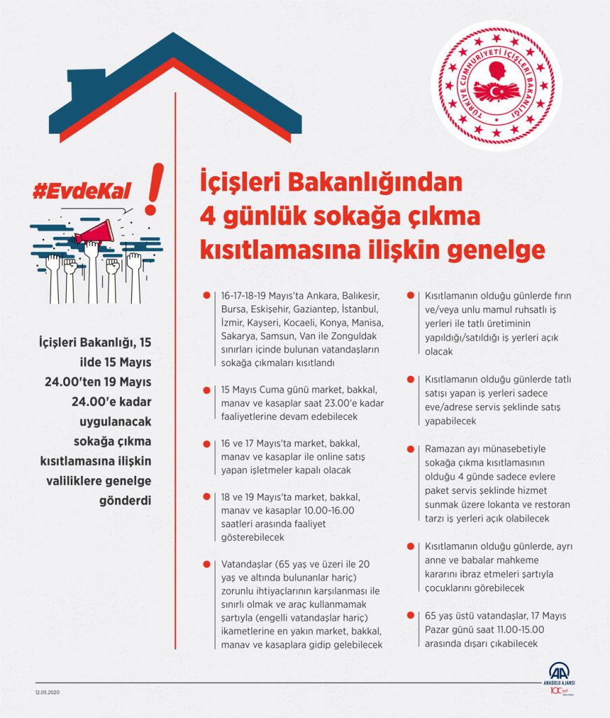 Genelge kapsamında, 15 Mayıs saat 24.00 ile 19 Mayıs saat 24.00 arasında belirtilen istisnalar hariç olmak üzere büyükşehir statüsündeki Ankara, Balıkesir, Bursa, Eskişehir, Gaziantep, İstanbul, İzmir, Kayseri, Kocaeli, Konya, Manisa, Sakarya, Samsun ve Van ile Zonguldak olmak üzere toplam 15 il sınırları içinde bulunan vatandaşların sokağa çıkmaları kısıtlandı.